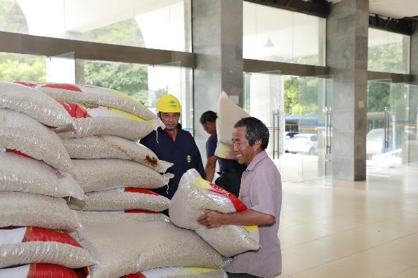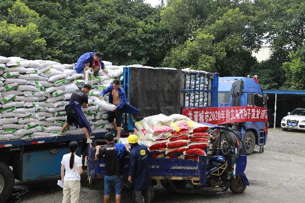 7月21日,在共青城市农业农村水利局大院,各乡镇正组织车辆搬运刚刚到达的水稻种子。种粮大户范金福在共青城市承包了近千亩水稻,早稻和中稻都不同程度被淹,目前,正在积极抢收早稻,中稻基本绝收。这次免费领取的3000斤水稻种子一定程度上减少了他的损失。“现在受灾的中稻有400余亩,到现在还一直被淹在水里,早稻也被淹了一些。我领到了3000斤种子,现在就等排灌站抽完水,我们就可以播种了。”范金福说。