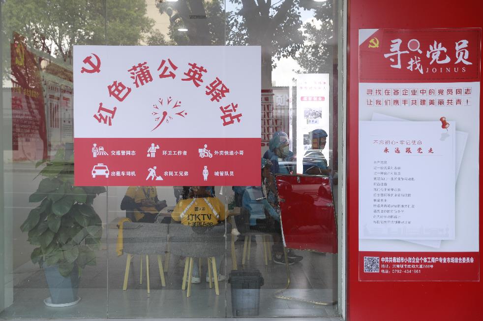 红色蒲公英驿站依托共青城市“小个专”党群服务中心,坚持党建引领,聚焦外卖快递小哥、出租车司机、环卫工人、交警、农民工、城管队员等户外劳动者,设有临时休息区、图书阅读区、党员活动区和志愿服务区,配套公厕、空调,提供免费充电、Wi-Fi、饮水、急救药箱、雨伞、微波炉、冰箱、老花镜、失物招领等暖心服务,每天8:00至20:00对外开放,让大家在劳动之余有个歇脚休息的场所。