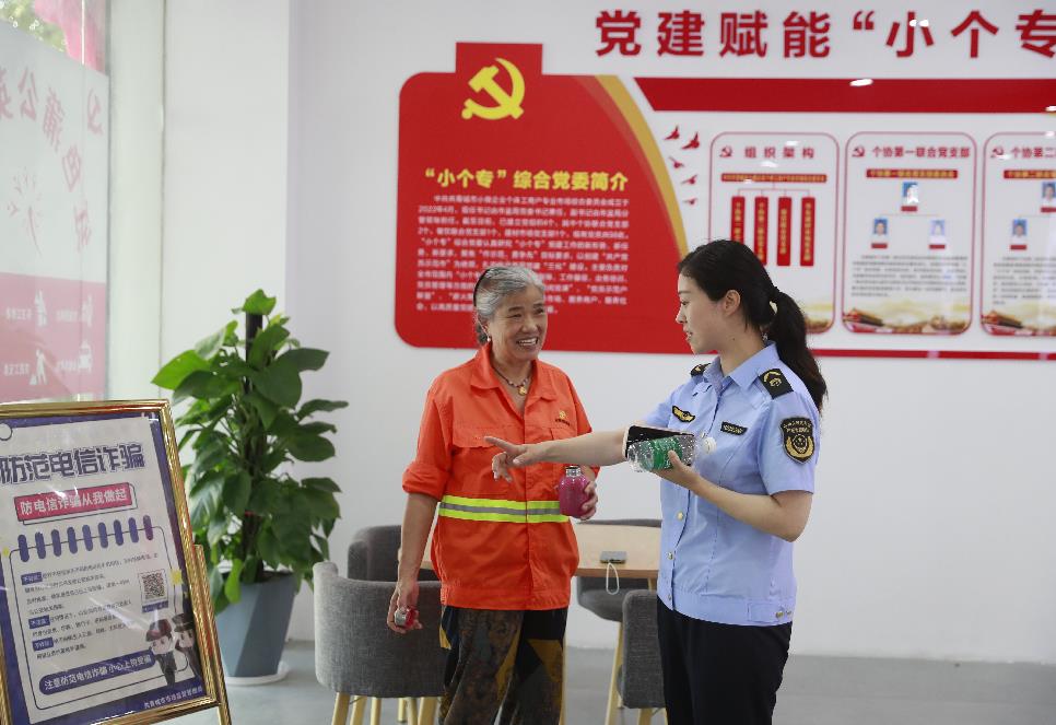 ▲为清洁工人讲解“防范电信诈骗”知识