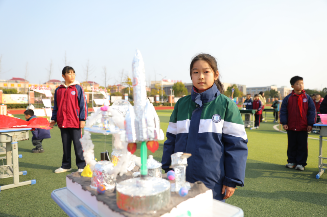 “我的作品分三个部分!航天火箭用针管做液压装置,按下去就能起飞;星际飞船顶部装了磁铁,靠磁吸力实现悬浮;航天卫星还装了太阳能板,能把太阳光转化成电能带动翻板转动。”学生魏怡萱指着自己的作品,骄傲地介绍道,眼里满是对科学的热爱。