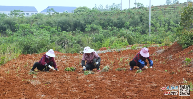 在共青城市苏家垱乡青山村的艾叶种植基地,当地村民正趁着晴好天气忙着种植艾叶,一边打孔一边种植,一个上午就能种下一大片。