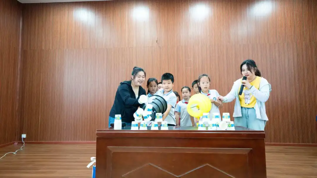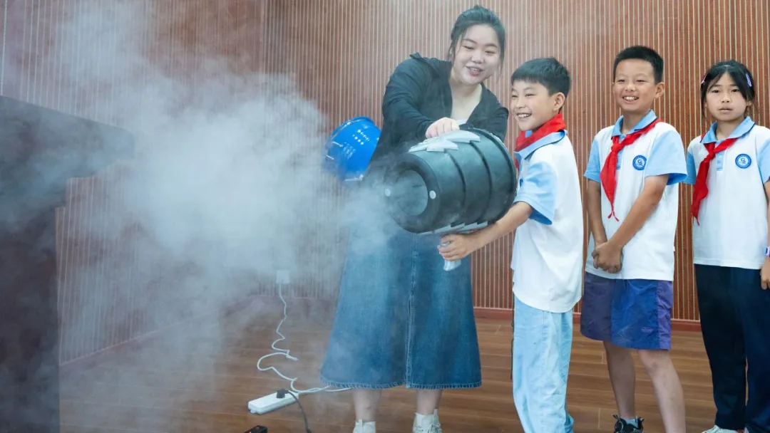 “小型空气炮可以打倒一米外的纸杯,那大家知道它打出来的空气是什么形状的吗?”为让同学更加直观地观察到空气的形状,科技辅导员一边将烟雾装入了圆形孔的空气炮内,一边提问道。