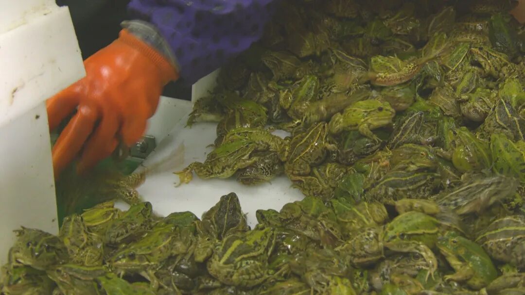 操作员正在把鲜活的黑斑蛙