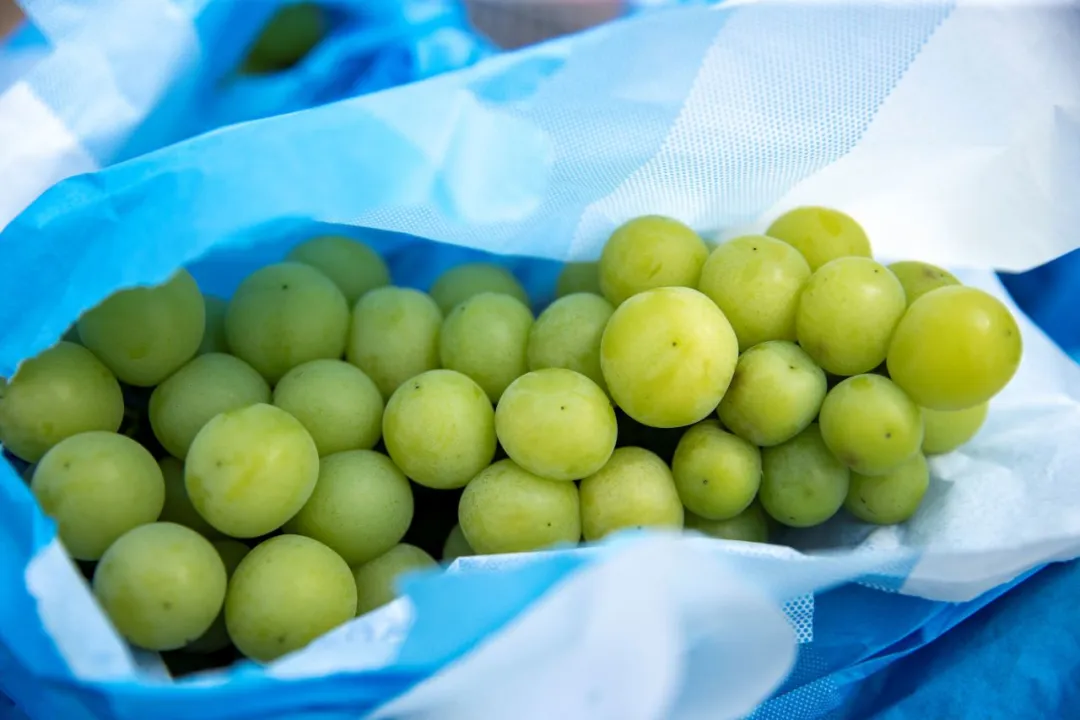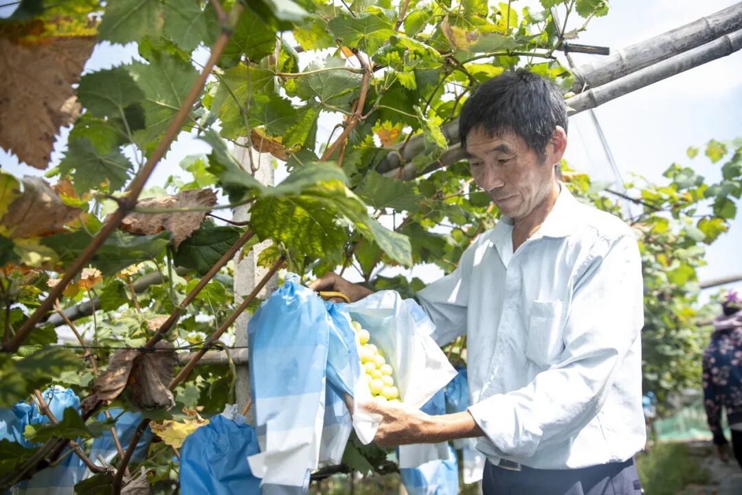 一串串套着纸袋的葡萄挂满枝头