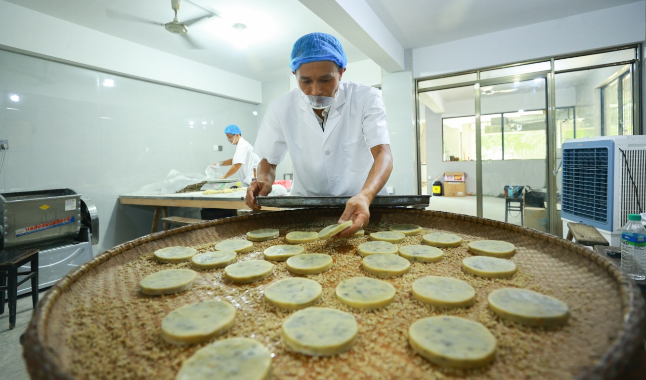9月10日,在泽泉乡泽泉街林氏糕点的工作间里,林金华和家人正在赶制中秋月饼,他们分工明确、动作娴熟、配合默契,配馅、和面、称重、包馅、压模、上麻、烘烤、出炉……不一会儿,一个个新鲜出炉的手工月饼散发着诱人的香气,让人垂涎欲滴。