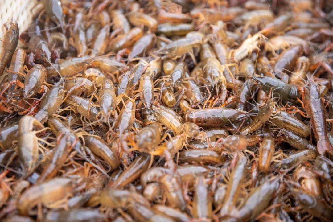 一筐筐鲜活的小龙虾虾苗整齐码放