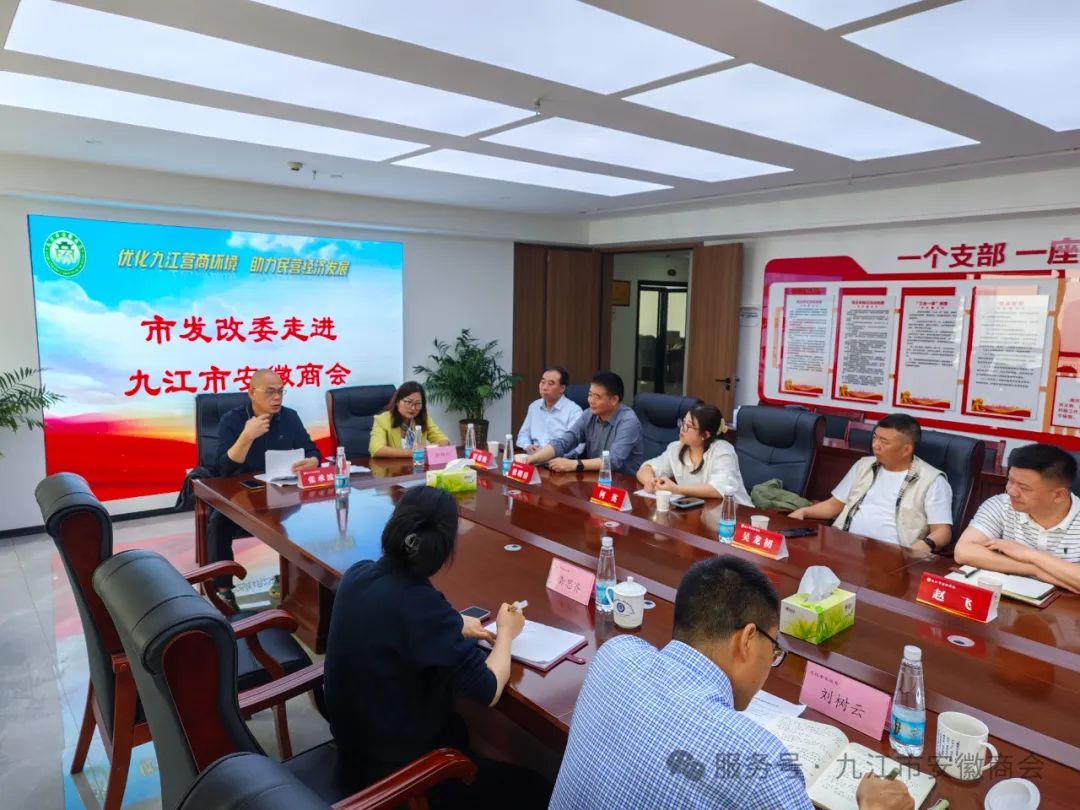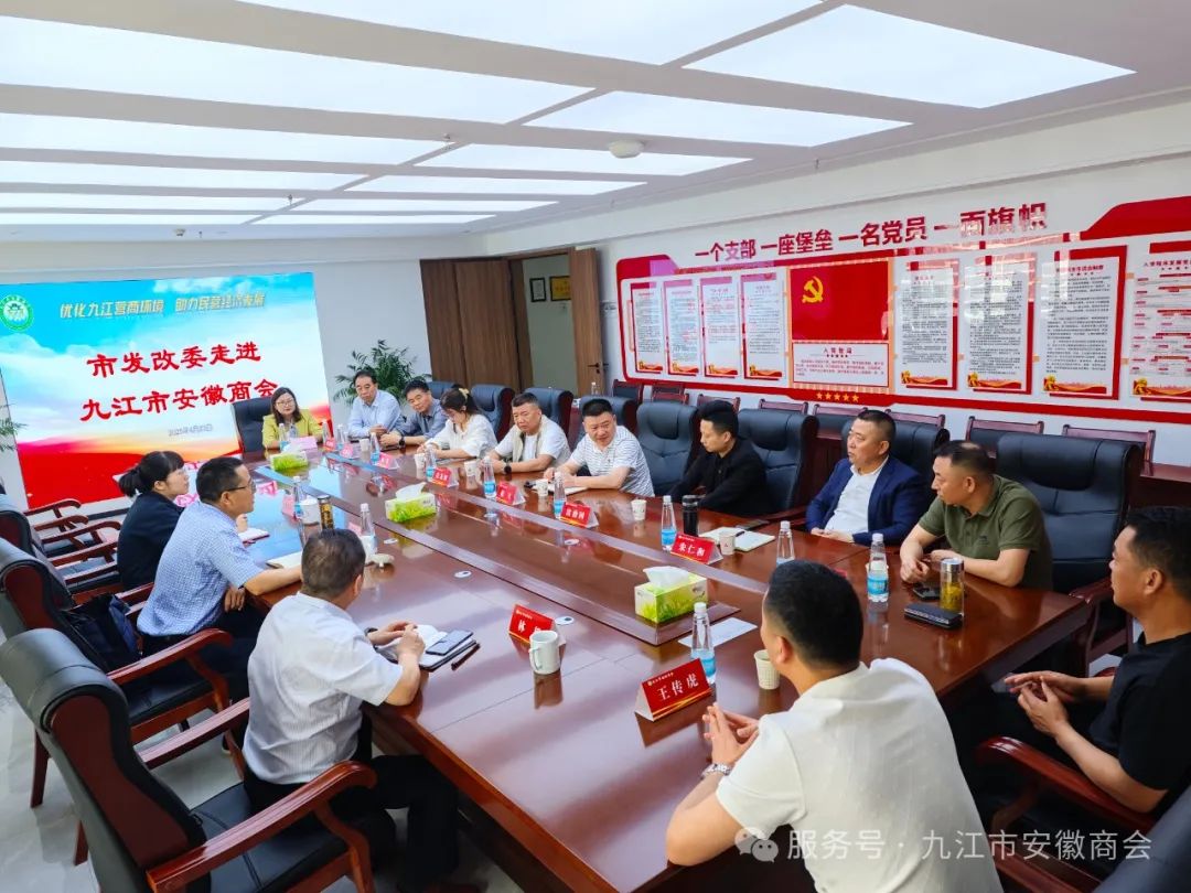 九江市发改委为进一步构建亲清政商关系,强化与商会对接联系,4月23日上午,市发改委党组成员、副主任刘树云,绿发中心综合协调科副科长熊晓月等一行来到结对单位——九江市安徽商会召开座谈会。会议主要议题:商会会员企业对九江优化营商环境的意见建议,找准问题症结,共商解决的对策和建议;惠企政策落实情况,近距离感知会员企业对政策措施的真实感受;共商相关涉企问题诉求,提高诉求办理质效,促进涉企诉求清仓见底。商会会长赵飞,常务副会长吴龙初、何英、沈治国、朱仁和、张明清,秘书长林超,副会长潘为君、梁慈腾、沈士顺,理事张承波、王传虎、靳艳红及秘书处工作人员参加了座谈交流。