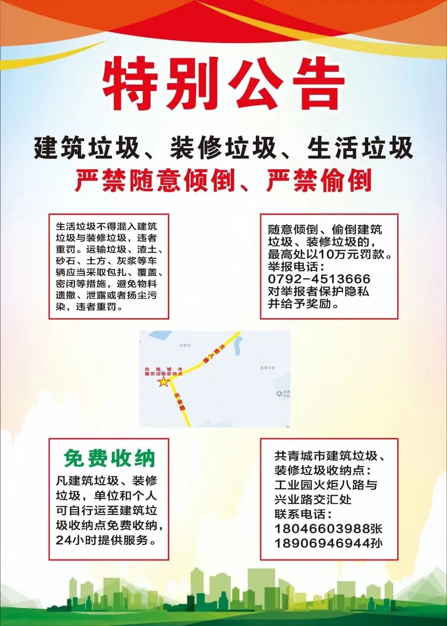 2.共青城市建筑垃圾收纳点位于工业园火炬八路与兴业路交汇处,凡建筑垃圾、装修垃圾,单位和个人可自行运至建筑垃圾收纳点免费收纳,24小时提供服务。