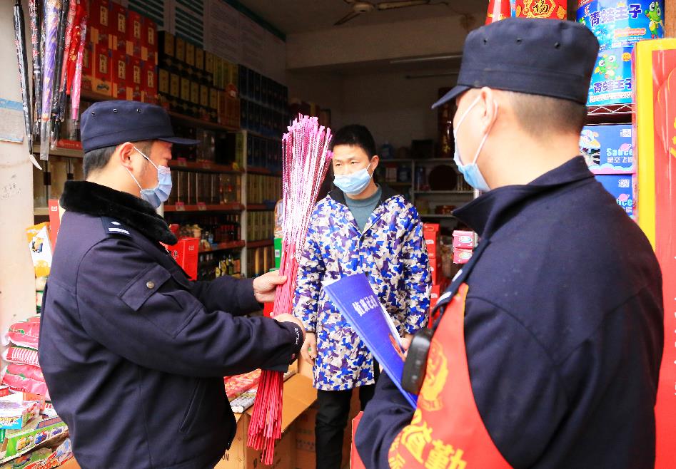 随着春节临近,烟花爆竹又“响”起来了。目前,中心城区全面禁燃禁爆,但乡镇范围尚未涉及,农村地区依然有春节期间燃放花炮习俗。连日来,各乡镇派出所组织警力,以发放宣传单、摆放宣传展板、上门宣讲等形式,强化了对花炮市场的安全监管力度。图为2月5日上午,共青城市公安局苏家垱派出所民警对辖区烟花鞭炮销售点开展安全整治回头看,重点检查销售点产品摆放是否符合要求、销售产品是否合格、有无三无产品、前期发现问题是否整改到位等,严防春节期间出现安全事故。 (刘志坚/图)