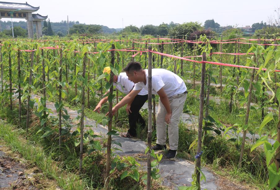 ▲汪成军和项目负责人村干部一起查看紫山药长势