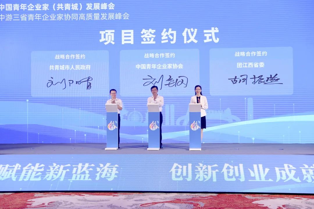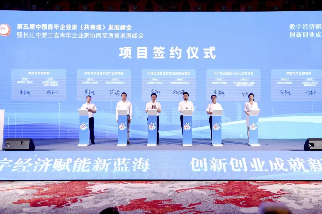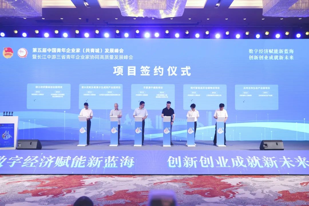 8月23日,第五届中国青年企业家(共青城)发展峰会暨长江中游三省青年企业家协同高质量发展峰会举行。中国工程院院士谢明勇、中国青年企业家协会常务副会长许华平、中国青年创业就业基金会秘书长王晓辉,共青城市委书记卢治轩,共青城市委副书记、市长刘阳青出席。