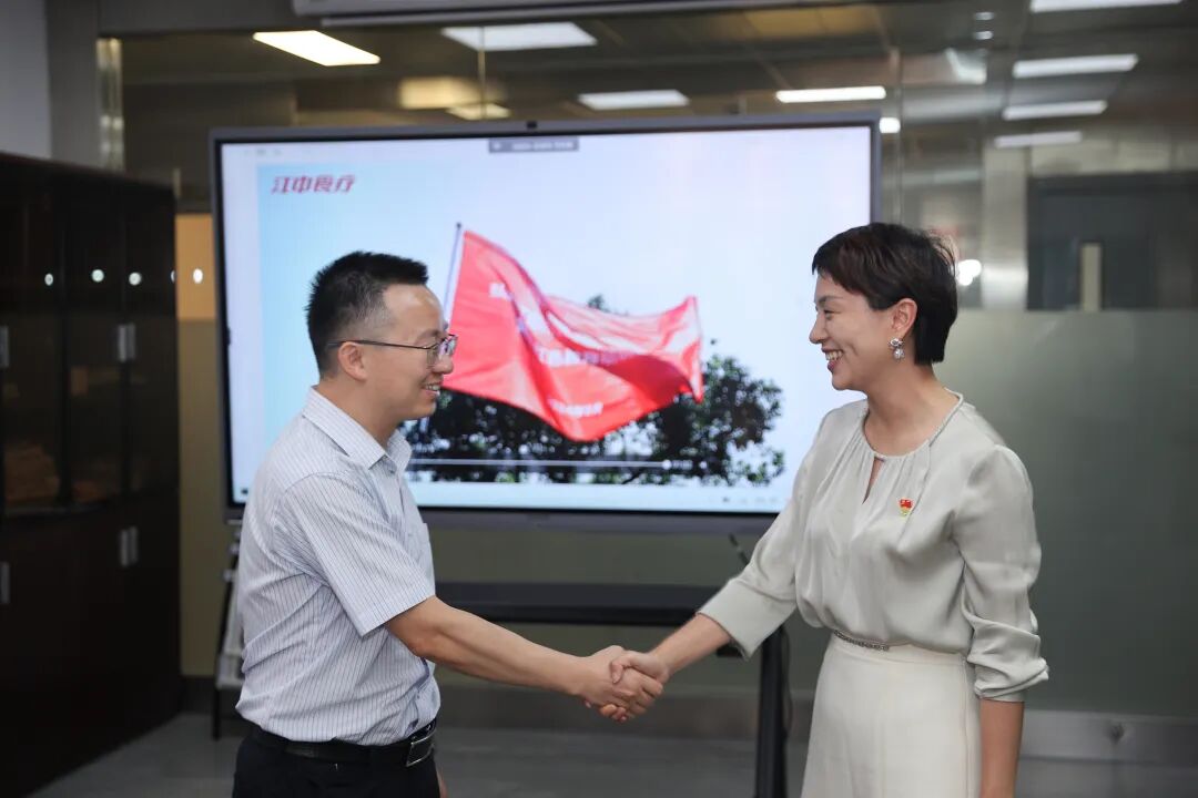 在江中食疗科技有限公司,刘阳青向九江市优秀党务工作者程馨送上节日的问候和组织的关怀,希望她继续发挥党员先锋模范作用,以党的理论联系企业工作实际,以高质量党建促进企业高质量发展。