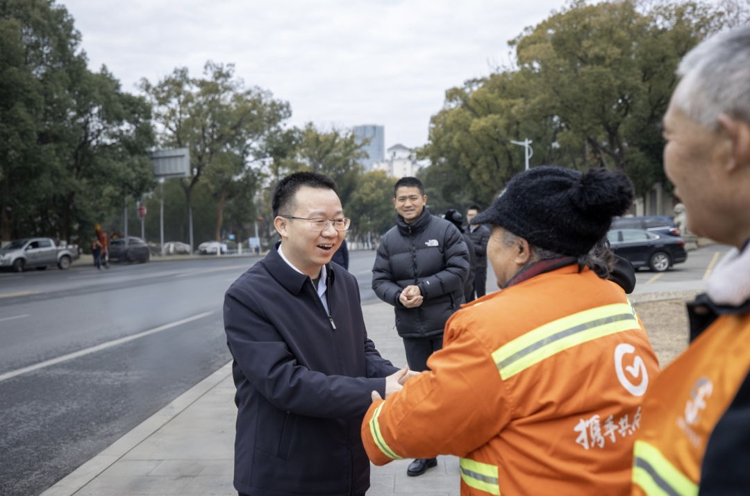 在老市政府广场,刘阳青向坚守在工作岗位上的环卫工人致以节日的问候和祝福,并关切地询问他们的生活和工作情况,感谢他们为改善城市环境、提升城市形象付出的辛勤劳动,希望大家继续发扬爱岗敬业、无私奉献的精神,当好城市“美容师”。