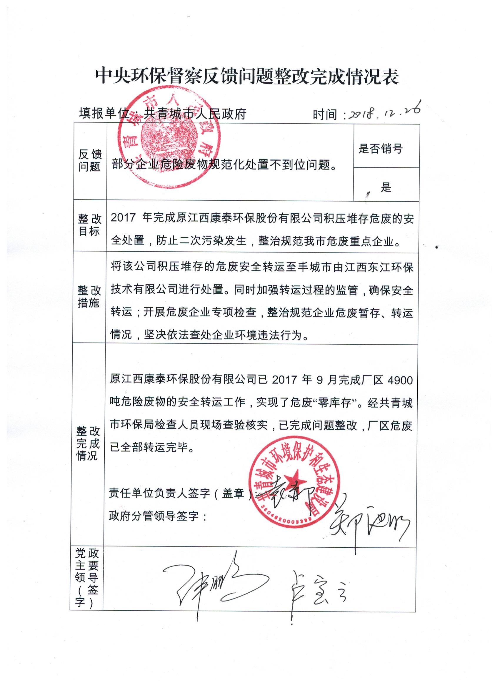 中央环保督察反馈问题(部分企业危险废物规范化处置不到位)整改完成情况表