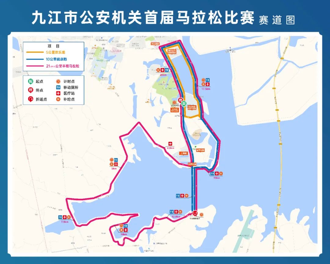健康跑(10公里):共青城市委党校—富华大道—南湖大桥北端—南湖大桥桥上(折返)—南湖大桥北端—富华公园外湖跑道(右转)—花园里小区—小胖子龙虾馆—天虹红绿灯—富华大道—共青城市委党校(健康跑终点)