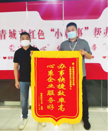 9月28日,一面印有“办事快捷效率高,心系企业服务好”字样的锦旗由鸭鸭股份公司送至共青城市红色“小赣事”帮办代办服务中心,这是对共青城市红色“小赣事”帮办代办队伍暖心服务的肯定以及爽心办事的感谢,随着这面锦旗的到来,共青城市红色“小赣事”帮办代办服务中心迎来了本月第三面锦旗。