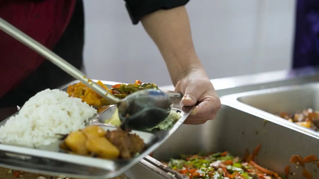 走进米粮铺社区幸福食堂,卤鸭块、蒜薹炒肉、时令蔬菜等8道菜品整齐陈列,荤素搭配。社区60岁以上老年人和小学生群体有专属搭配——两荤两素一汤(含米饭)仅需8元。
