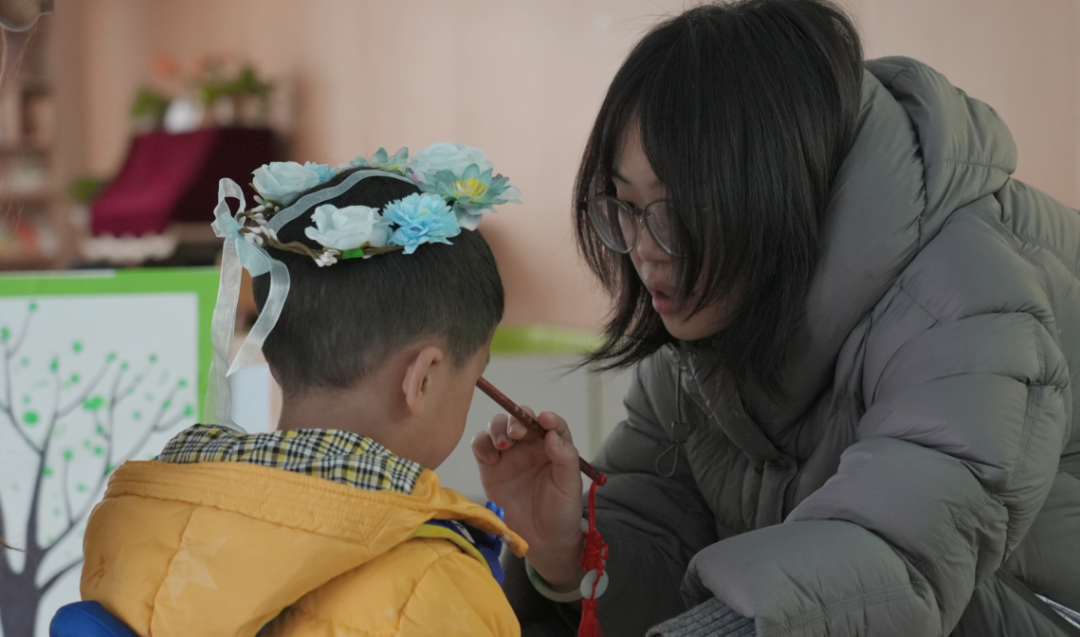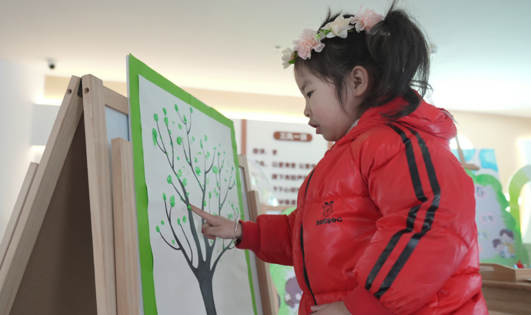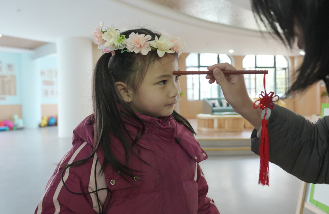 插春、戴春、咬春、躲春、点春……孩子们在家长陪伴下,亲手插下花枝,戴上春环,品尝时令春味,解锁专属春日的仪式感。最受欢迎的点春环节,老师用朱砂为孩子们点上眉心红点,寓意朱砂启智、眼明心亮;孩子们也用稚嫩的指尖点画色彩,描绘新学期的美好期许。