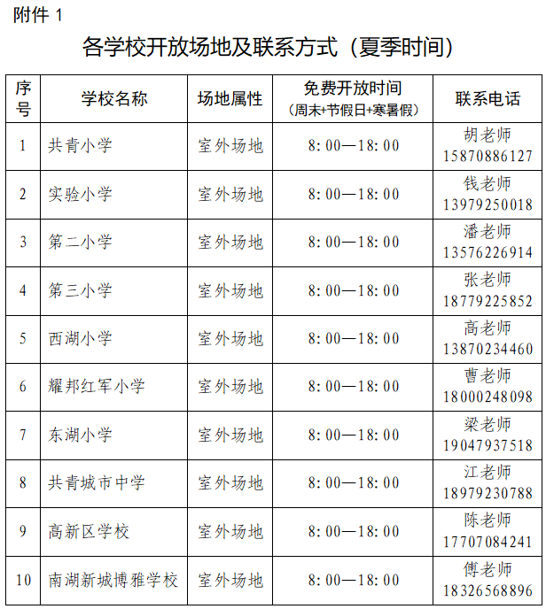 1. 10所中小学室外场地(田径场、篮球场、足球场等):共青小学、实验小学、第二小学、第三小学、西湖小学、耀邦红军小学、东湖小学、共青城市中学、高新区学校、南湖新城博雅学校。