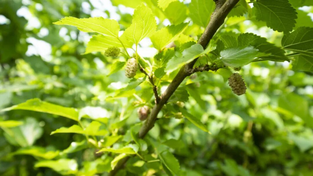 成片桑树挂满紫红饱满的桑葚果实