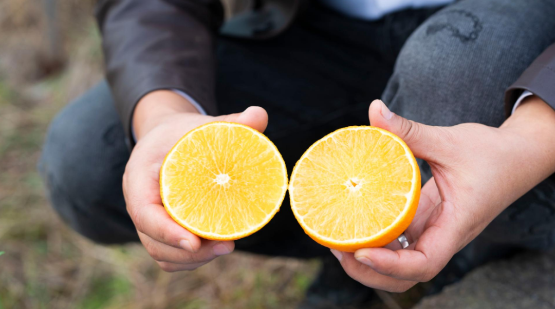 拿起一个刚摘下的果冻橙切开