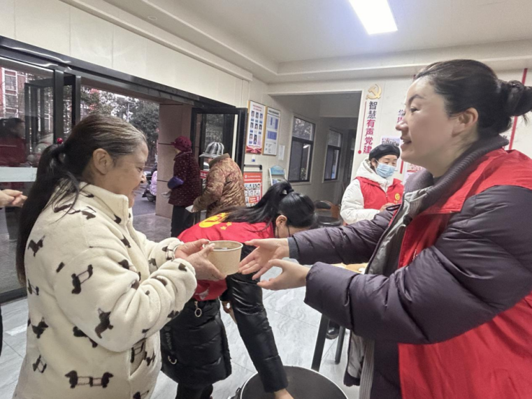 社区网格员与志愿者组成的“送粥小分队”,为12户独居与行动不便的老人上门送粥。