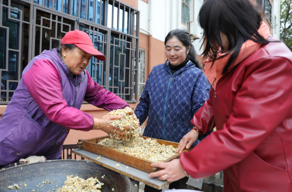 1月27日,在茶山街道金纺路小区里的空地上,炉火生起,铁锅架稳,空气中逐渐浮起焦糖、花生与芝麻交织的温厚甜香。居民陶冬莲和几位老邻居围在灶台旁,手中不停,话语含笑,一起制作传统冻米糖。