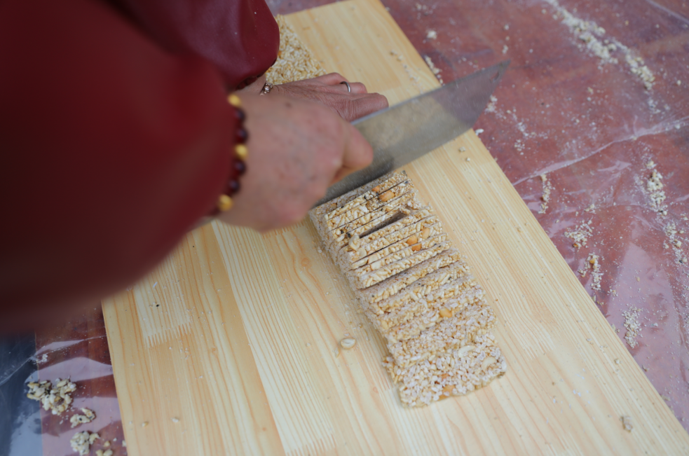 陶冬莲是这群人里最懂这门手艺的。年轻时她就常和老伴一起,谁家嫁女娶媳,总少不了请他们帮忙。一个拌糖,一个切块,配合了几十年。今天,她像往年一样招呼起左邻右舍:“咱们一起做,热闹。”