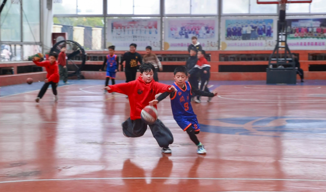 球场上,少年们奔跑、跳跃、抢断、投篮,每个动作都充满力量与朝气,篮球带来的快乐洋溢在整个场馆中。