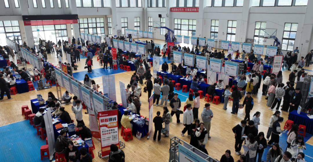 招聘会现场,企业展位前挤满了前来咨询投递简历的学生。