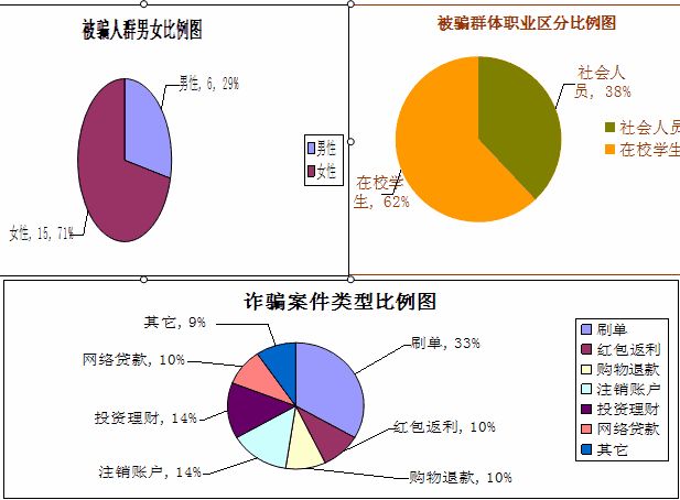 2020年10月9日-2020年10月18日,共青城市公安局反诈中心共接到电信网络诈骗刑事案件共21起,在我辖区反诈中心接到的电诈案件中,被骗资金共80.7万余元,单起最高被骗23.8万元,首先虚假投资理财类诈骗损失最为突出,其次是刷单返利类发案最高、虚假征信类诈骗依旧高发。其中校园类案件13起,社会类案件8起。