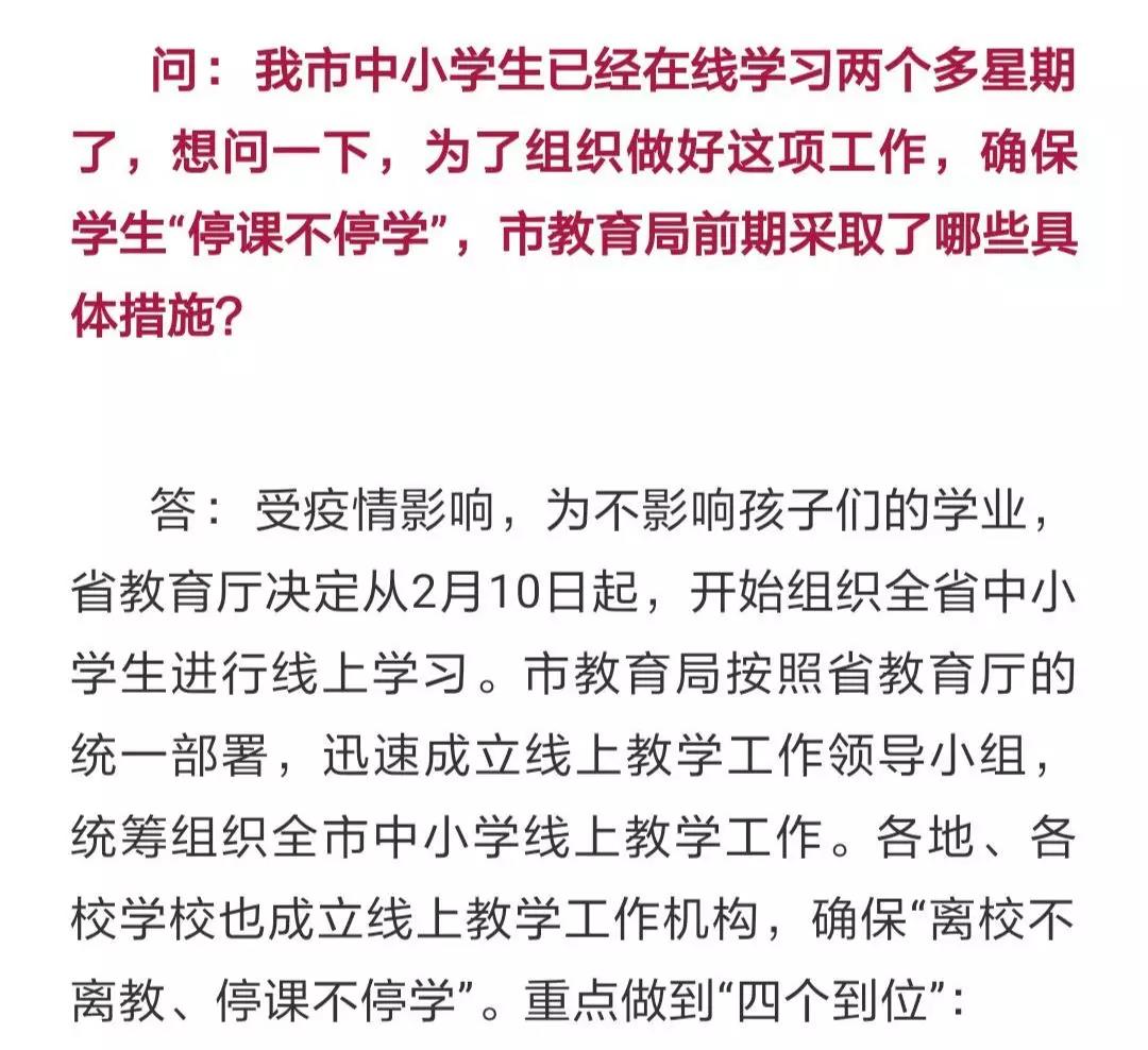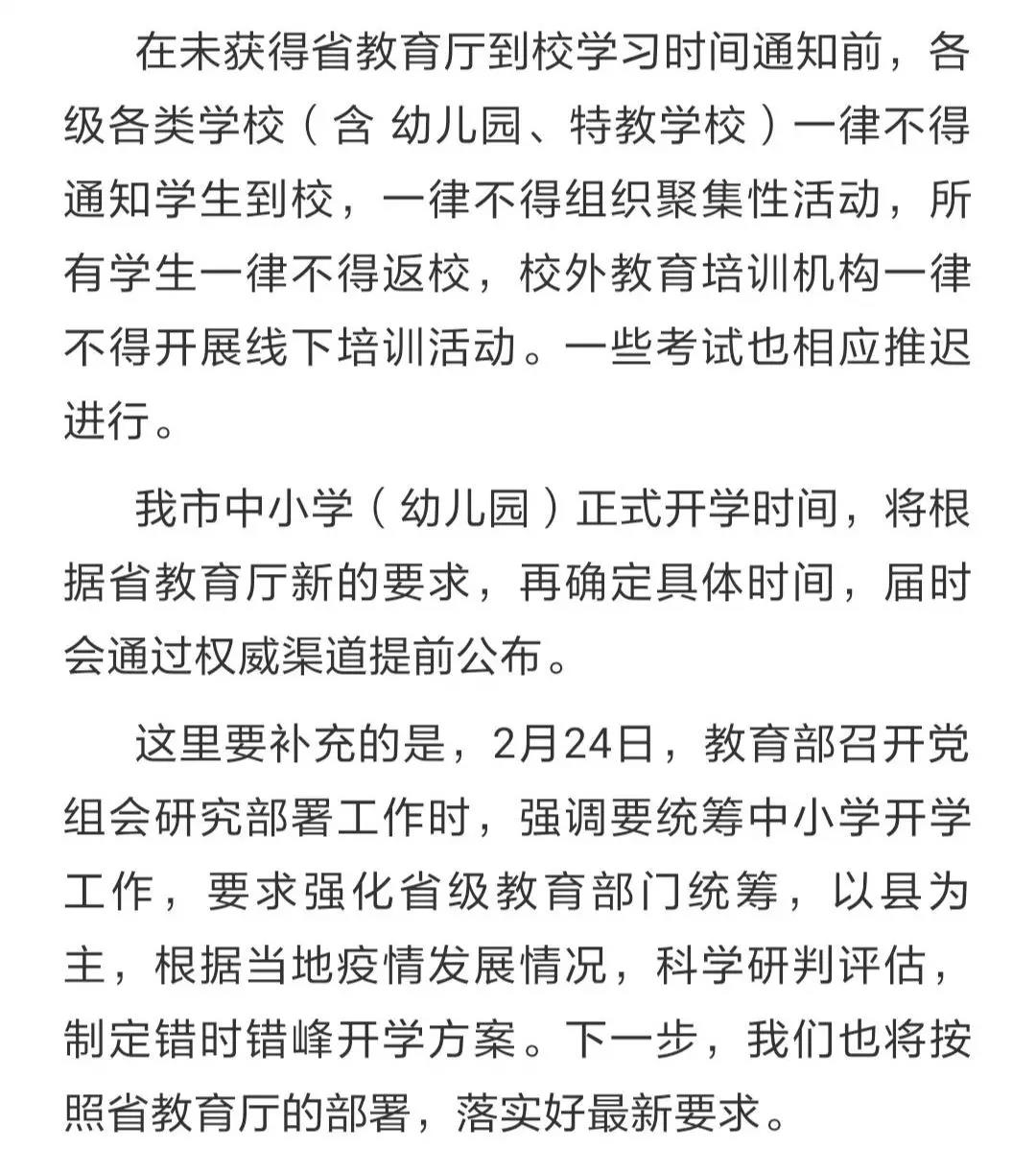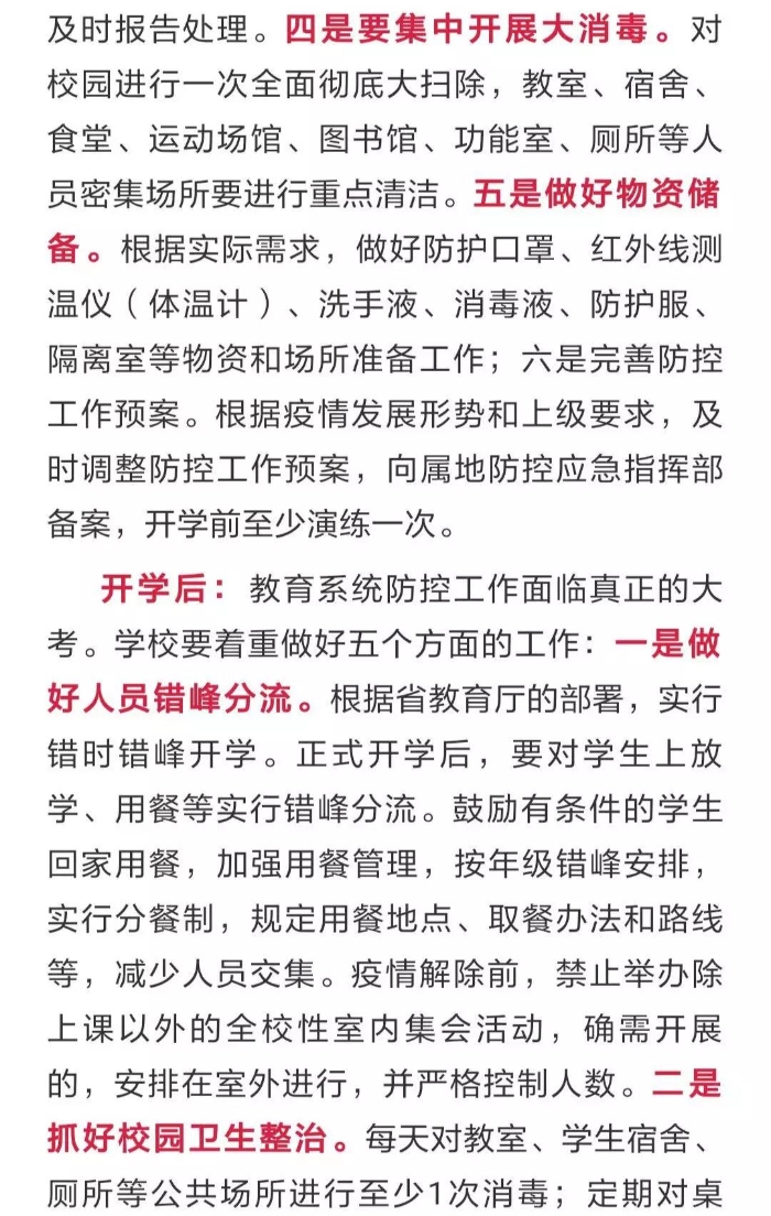 (一)迅速落实上级部署。及时组织学习习近平总书记重要指示、李克强总理重要批示,中央、省、市会议精神,在市疫情防控工作指挥部的领导下,研究部署推进防控工作;按照省委教育工委、省教育厅要求,第一时间对全市教育系统新冠肺炎疫情防控工作作出部署安排;及时重申寒假补课禁令,暂停所有校外培训机构线下培训,严格执行延期开学规定,任何学校、任何年级不得组织集体补课、不得提前开学。各地各校迅速行动、周密安排,确保了疫情防控及早有序开展。