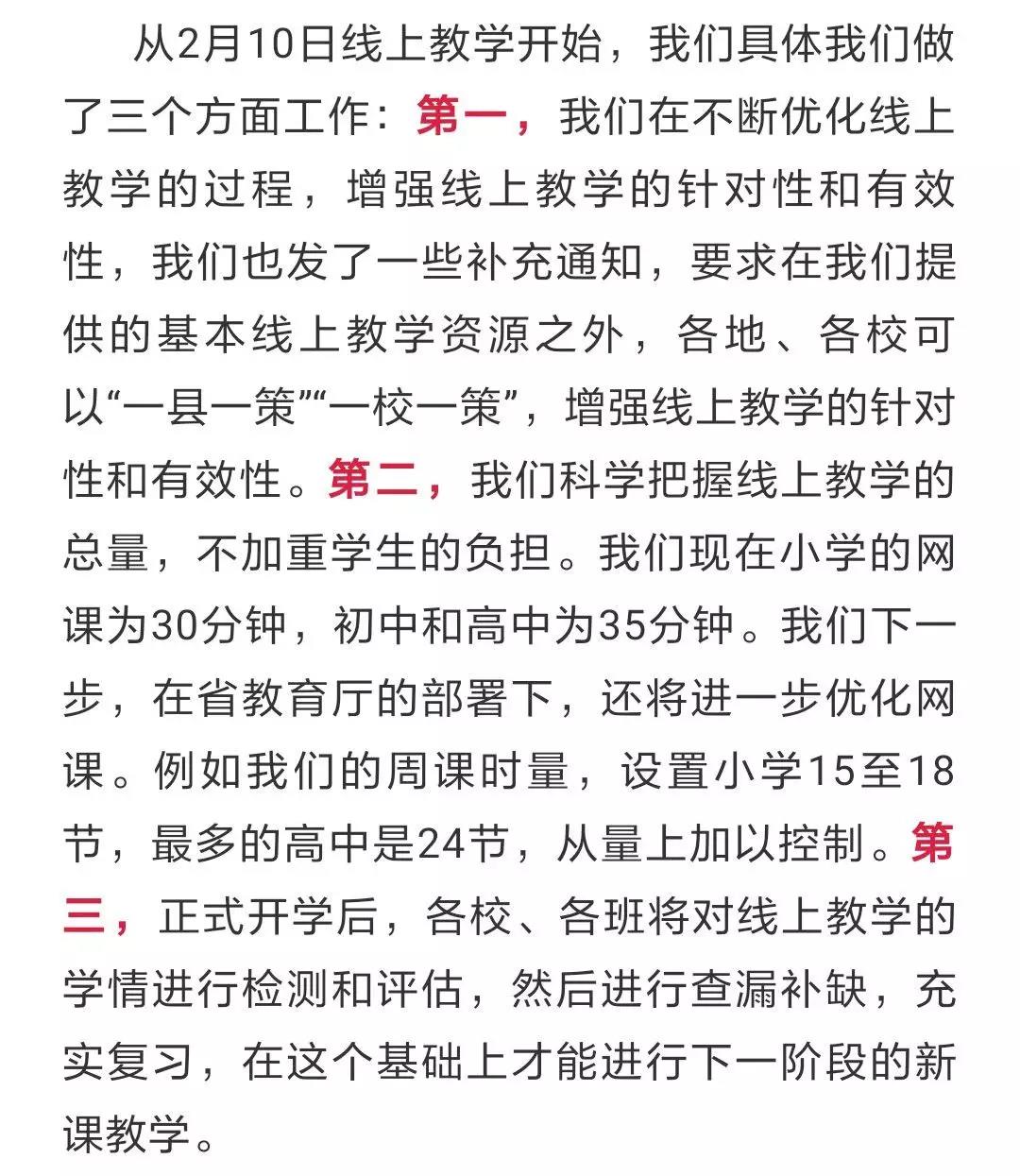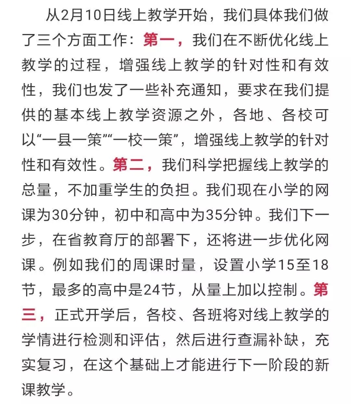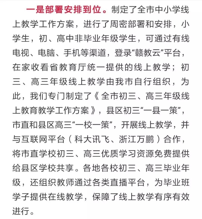 (五)精心组织线上教学。按照省教育厅“停课不停学”统一部署,市教育局专门成立线上教学工作领导小组,统筹组织全市中小学线上教学工作。主要做了三个方面的工作:一是圆满完成录课任务。65位中小学名师、35名录课工作人员,克服时间紧、任务重的困难,舍小家、顾大家,仅用7天优质高效地完成了省教育厅安排我市负责录制的244节网课录制任务,已陆续在“赣教云”平台播出。二是努力做到“不落一人”。加强线上教学宣传,督促各地各校协调解决学生线上收看设备保障问题,科学组织实施初三、高三年级线上教学工作,全市中小学生线上学习参与率达99.99%以上。三是注重线上思政教育。线上教学中,市教育局还把疫情变成教材,开通线上思政课堂,组织名优教师录播“全民抗疫,诉说家国情怀”“天下同心,共奏爱国主义赞歌”主题讲座。双峰小学录制《抗击疫情,大家在行动》,九江小学录制《不屈的中国人》,同文中学录制《致敬“逆行者”》,近日正式在江西省统一线上教育教学平台——赣教云开播;开展以“我能在抗击疫情中做什么”主题教育等活动,通过征文和绘画展示活动,学生结合自身见闻感受,表达对抗击疫情的认识、感悟,讴歌万众一心、众志成城和医者仁心、大爱无疆的精神,歌颂中国共产党的领导和中国特色社会主义制度的优越性,进一步激发学生爱国热情、家国情怀,培养有社会责任感、有担当奉献精神的时代新人。这一做法得到了广泛关注,中央、省、市媒体密集报道,人民日报、新华社、光明日报、学习强国客户端,央视视频、人民网、中国文明网、搜狐网、江西宣传微信公众号、江西新闻客户端均作了报道。