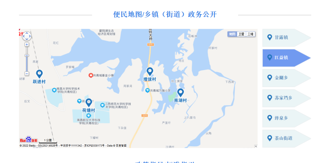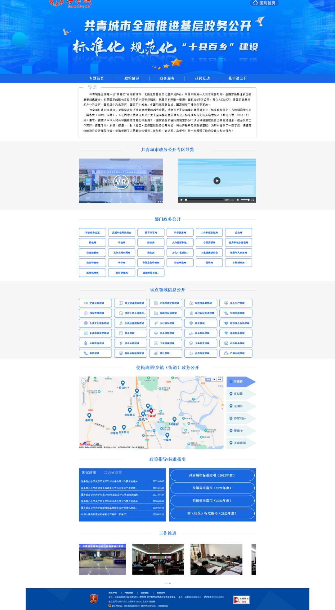 根据全省基层政务公开标准化规范化“十县百乡”导引要求,在共青城市门户网站创建共青城市基层政务公开标准化规范化“十县百乡”建设专栏,并进一步优化了框架布局,通过部门菜单+地图导航模式将公开触角延伸到村(社区),进一步规范和丰富了线上信息公开内容。