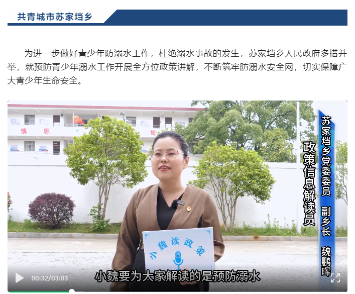 如何让“政事”真正走进老百姓心里?苏家垱乡政府高度重视、高位推动、高效落实,亮出诸多新招,图解、录制视频、乡村大喇叭、现场宣讲等“十八般武艺”齐上阵,成功搭建“连心云”平台,积极传播基层政务公开“最强音”。《小魏读政策》就是其中创新栏目之一,由分管便民服务的本地班子成员担任政策信息解读员,用普通话、苏家垱乡方言“双语”解读的政策定期在“共青城市人民政府”公众号发布,目前已录制发布疫情防控、防溺水、农民建房、宣传秸秆焚烧等短视频6期,多次被“九江市人民政府”“共青城发布”公众号等多家媒体转发,累计播放量达1万余次,下一步将陆续推出社会救助、退役军人优抚等政策解读视频。