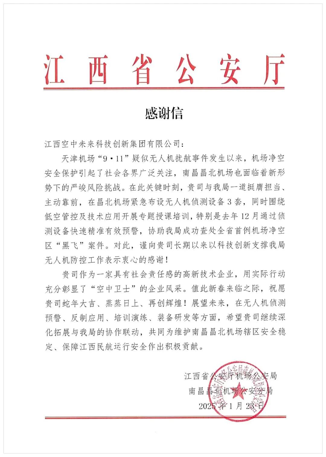 为确保机场净空安全,江西空中未来科技创新集团有限公司与江西省公安厅机场公安局南昌昌北机场公安分局一道,在昌北机场布设多套无人机侦测设备,同时围绕低空管控及技术应用开展专题授课培训。还多次受邀到江西省公安厅机场公安局,为公安干警们开展无人机防控及技术应用培训,为守护机场净空安全奠定了坚实基础 。