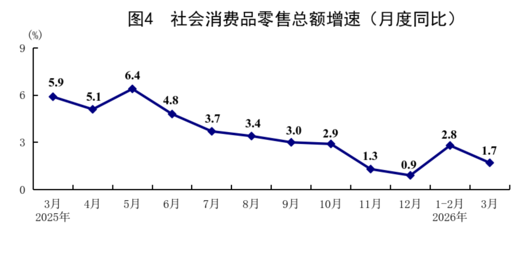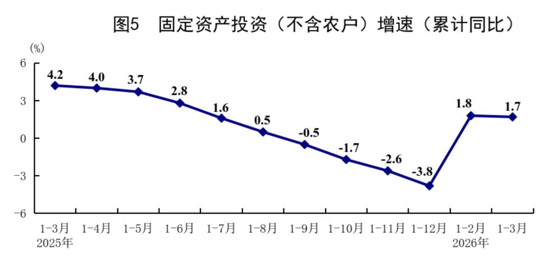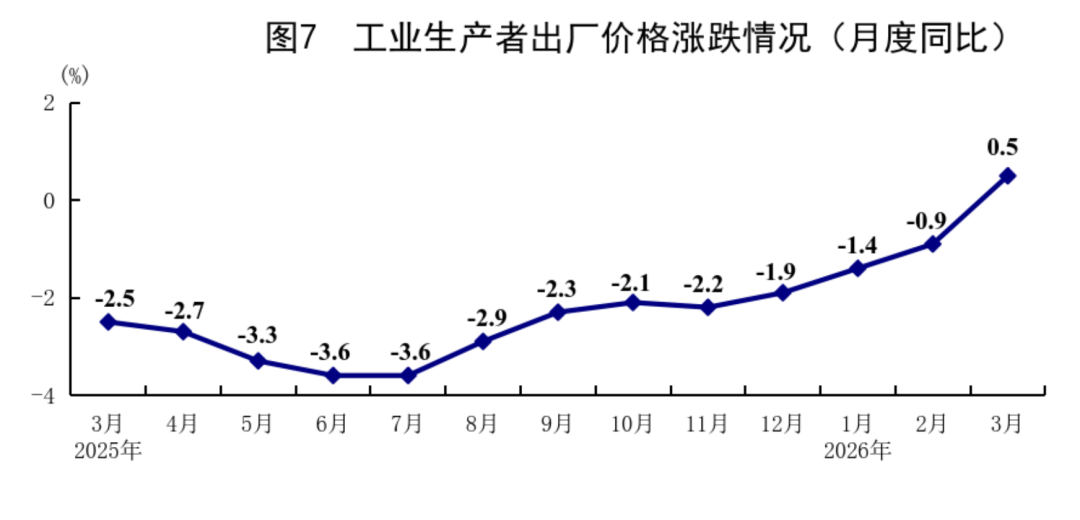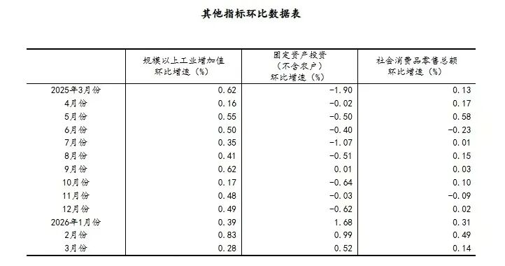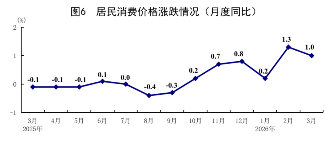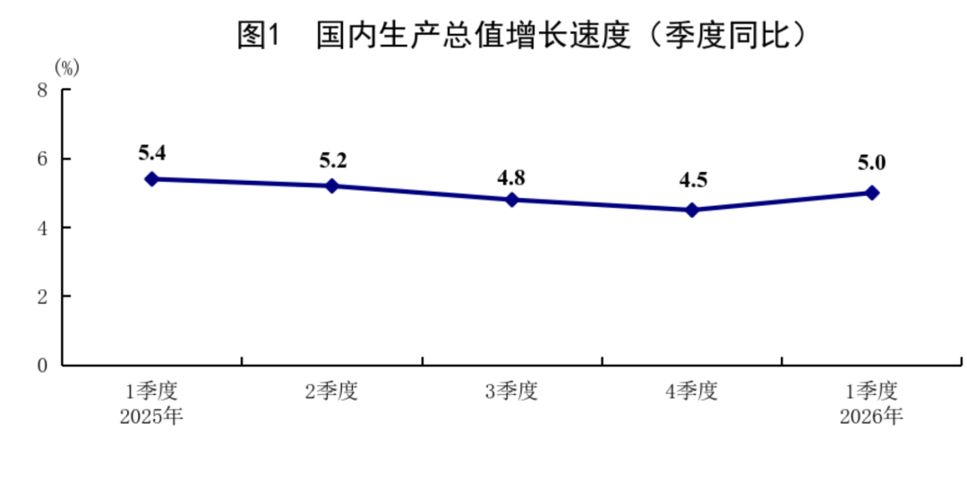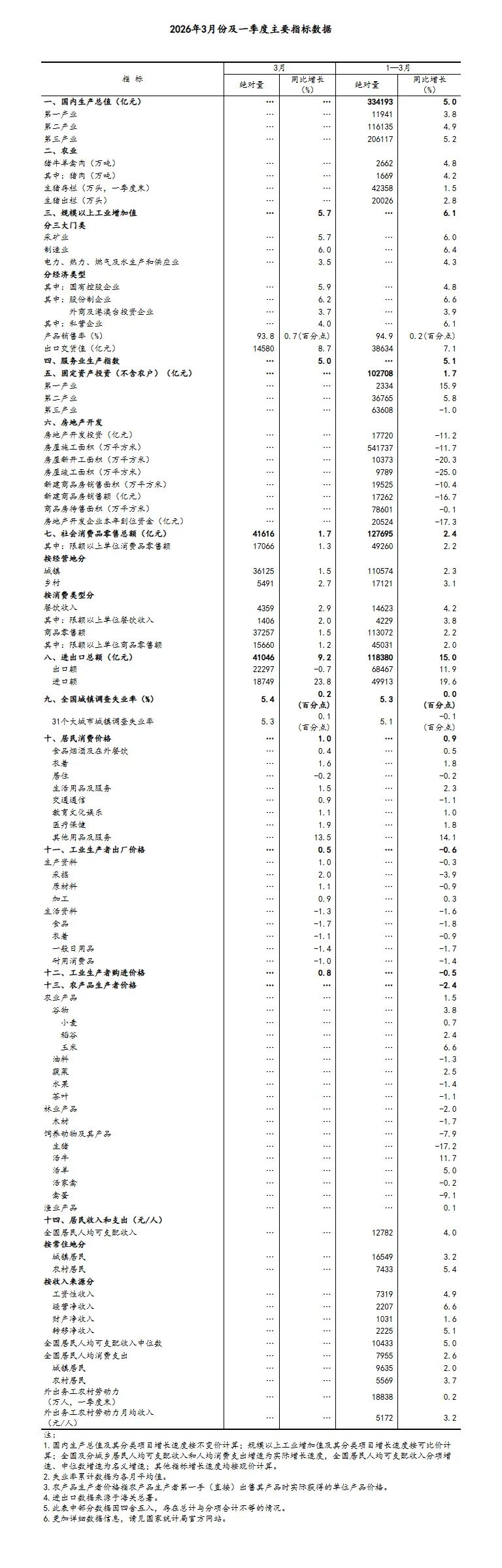 一季度,在以习近平同志为核心的党中央坚强领导下,各地区各部门深入贯彻落实党中央、国务院决策部署,加紧实施更加积极有为的宏观政策,着力稳就业、稳企业、稳市场、稳预期,加快培育发展新质生产力,生产供给增长加快,市场需求继续改善,就业形势总体稳定,市场价格温和回升,高质量发展向新向优,国民经济实现良好开局,发展韧性和活力进一步彰显。初步核算,一季度国内生产总值334193亿元,按不变价格计算,同比增长5.0%,比上年四季度加快0.5个百分点。分产业看,第一产业增加值11941亿元,同比增长3.8%;第二产业增加值116135亿元,增长4.9%;第三产业增加值206117亿元,增长5.2%。从环比看,一季度国内生产总值增长1.3%。一季度,农业(种植业)增加值同比增长3.7%。冬小麦播种面积保持稳定,苗情持续向好转化,春耕备耕进展顺利。据全国种植意向调查显示,今年粮食意向播种面积总体稳定,其中,稻谷面积基本持平,玉米面积稳中有增。一季度,猪牛羊禽肉产量2662万吨,同比增长4.8%,其中,猪肉、禽肉产量分别增长4.2%、9.3%,牛肉、羊肉产量分别下降1.4%、2.0%;牛奶产量增长3.4%,禽蛋产量下降3.1%。一季度,生猪出栏20026万头,同比增长2.8%;季末生猪存栏42358万头,增长1.5%。二、工业生产增长加快,装备制造业和高技术制造业快速增长一季度,全国规模以上工业增加值同比增长6.1%,比上年四季度加快1.1个百分点。分三大门类看,采矿业增加值同比增长6.0%,制造业增长6.4%,电力、热力、燃气及水生产和供应业增长4.3%。装备制造业增加值同比增长8.9%,高技术制造业增加值增长12.5%,分别快于全部规模以上工业增加值2.8和6.4个百分点。分经济类型看,国有控股企业增加值同比增长4.8%;股份制企业增长6.6%,外商及港澳台投资企业增长3.9%;私营企业增长6.1%。分产品看,3D打印设备、锂离子电池、工业机器人产品产量同比分别增长54.0%、40.8%、33.2%。3月份,规模以上工业增加值同比增长5.7%,环比增长0.28%。3月份,制造业采购经理指数为50.4%,比上月上升1.4个百分点;企业生产经营活动预期指数为53.4%。1—2月份,全国规模以上工业企业实现利润总额10246亿元,同比增长15.2%。一季度,服务业增加值同比增长5.2%。其中,租赁和商务服务业,信息传输、软件和信息技术服务业,金融业,交通运输、仓储和邮政业,住宿和餐饮业增加值分别增长12.2%、10.6%、6.5%、4.3%、4.3%。3月份,全国服务业生产指数同比增长5.0%。其中,信息传输、软件和信息技术服务业,租赁和商务服务业,金融业生产指数分别增长11.8%、10.1%、6.7%。1—2月份,规模以上服务业企业营业收入同比增长7.4%。3月份,服务业商务活动指数为50.2%,比上月上升0.5个百分点;服务业业务活动预期指数为54.8%。其中,铁路运输、电信广播电视及卫星传输服务、货币金融服务、保险等行业商务活动指数位于55.0%以上较高景气区间。一季度,社会消费品零售总额127695亿元,同比增长2.4%,比上年四季度加快0.7个百分点。按经营单位所在地分,城镇消费品零售额110574亿元,同比增长2.3%;乡村消费品零售额17121亿元,增长3.1%。按消费类型分,商品零售额113072亿元,增长2.2%;餐饮收入14623亿元,增长4.2%。基本生活类和部分升级类商品销售增长较快,限额以上单位粮油食品类、服装鞋帽针纺织品类、通讯器材类、金银珠宝类商品零售额同比分别增长10.0%、9.3%、20.8%、12.6%。3月份,社会消费品零售总额同比增长1.7%,环比增长0.14%。一季度,服务零售额同比增长5.5%,增速与上年全年持平。其中,通讯信息服务类、旅游咨询租赁服务类、文体休闲服务类零售额较快增长。一季度,全国网上商品和服务零售额49774亿元,同比增长8.0%。其中,网上商品零售额31614亿元,增长7.5%,占社会消费品零售总额的比重为24.8%;网上服务零售额18160亿元,增长8.8%。一季度,全国固定资产投资(不含农户)102708亿元,同比增长1.7%,上年全年为下降3.8%;扣除房地产开发投资,全国固定资产投资增长4.8%。分领域看,基础设施投资同比增长8.9%,制造业投资增长4.1%,房地产开发投资下降11.2%。全国新建商品房销售面积19525万平方米,同比下降10.4%;新建商品房销售额17262亿元,下降16.7%。分产业看,第一产业投资同比增长15.9%,第二产业投资增长5.8%,第三产业投资下降1.0%。民间投资同比下降2.2%,降幅比上年全年收窄4.2个百分点;扣除房地产开发投资,民间投资增长1.3%。高技术产业投资同比增长7.4%,其中计算机及办公设备制造业,航空、航天器及设备制造业,信息服务业投资分别增长28.3%、19.0%、20.9%。3月份,固定资产投资(不含农户)环比增长0.52%。一季度,货物进出口总额118380亿元,同比增长15.0%。其中,出口68467亿元,增长11.9%;进口49913亿元,增长19.6%。一般贸易进出口同比增长9.0%。对共建“一带一路”国家进出口增长14.2%。民营企业进出口增长16.2%,占进出口总额的比重为57.3%。机电产品出口增长18.3%。3月份,进出口总额41046亿元,同比增长9.2%。一季度,全国居民消费价格(CPI)同比上涨0.9%,涨幅比上年四季度扩大0.4个百分点。分类别看,食品烟酒及在外餐饮价格同比上涨0.5%,衣着价格上涨1.8%,居住价格下降0.2%,生活用品及服务价格上涨2.3%,交通通信价格下降1.1%,教育文化娱乐价格上涨1.0%,医疗保健价格上涨1.8%,其他用品及服务价格上涨14.1%。在食品烟酒及在外餐饮价格中,猪肉价格下降11.3%,粮食价格下降0.3%,鲜果价格上涨4.3%,鲜菜价格上涨7.6%。扣除食品和