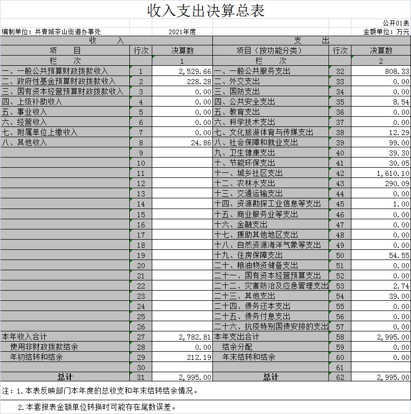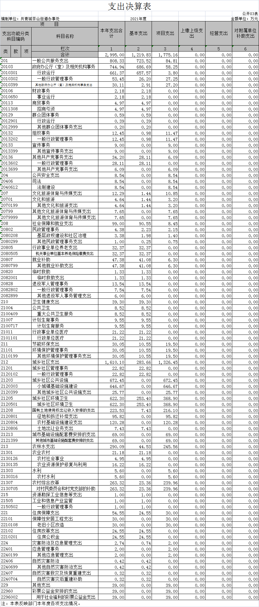 2021年共青城市茶山街道办事处支出预算总额为2131.07万元,其中按支出项目类别划分:基本支出511.65万元,包括工资福利支出476.17万元、商品和服务支出31.27万元、对个人和家庭的补助4.21万元;项目支出1619.42万元,包括工资福利支出261.44万元、商品和服务支出147.99万元、对个人和家庭的补助9.3万元、资本性支出998.58万元、对企业补助5.6万元、其他支出196.51万元。2021年财政总支出为2994.99万元,最终结果就是当年实现年初财政预算收支平衡的目标。