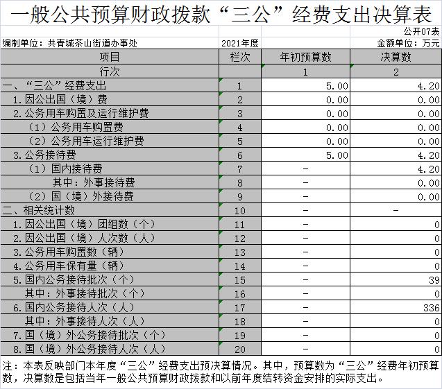 1、“三公”经费:反映财政拨款安排的因公出国(境)费、公务用车购置及运行费和公务接待费。其中,因公出国(境)费反映单位公务出国(境)的国际旅费、国外城市间交通费、住宿费、伙食费、培训费、公杂费等支出;公务用车购置及运行费反映单位公务用车车辆购置支出(含车辆购置税)及租用费、燃料费、维修费、过路过桥费、保险费、安全奖励费用等支出;公务接待费反映单位按规定开支的各类公务接待(含外宾接待)支出。