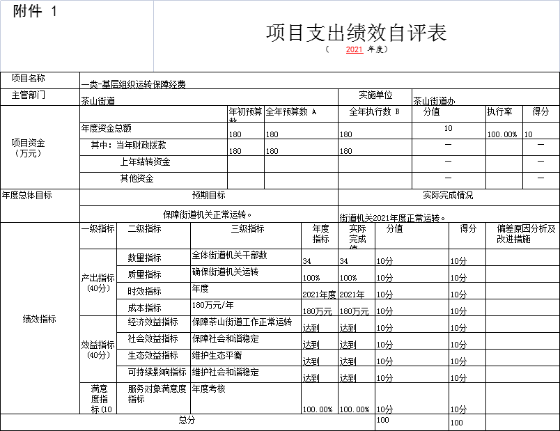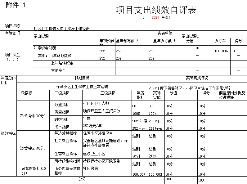 项目绩效自评总体综述:根据年初设定的绩效目标,“社区卫生保洁人员工资及工作经费”项目绩效自评得分为100分。项目全年预算数为252万元,执行数为252万元,完成预算的100%。项目绩效目标完成情况:一是保障环卫工人工资按时足额发放到位;二是保障小区环境卫生整洁。“一类基层组织运转保障经费”项目绩效自评得分为100分。项目全年预算数180万元,执行数为180万元,完成预算的100%。项目绩效目标完成情况:保障了茶山街道正常运转。发现的问题及原因:一是预算资金不准确,人员变动;二是临时性工作增加开支。下一步改进措施:加强业务管理提高资金使用效率。