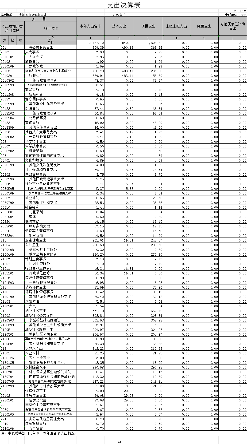 本部门2022年度支出总计2137.72万元,其中本年支出合计2137.72万元,较2021年减少857.28万元,下降40.10%,主要原因是:财政拨款收入减少;年末结转和结余0万元,较2021年减少0万元,增长(下降)0 %,主要原因是:未结转结余。