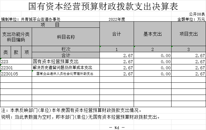 (十)国有资本经营预算支出年初预算数为0万元,决算数为2.67万元,完成年初预算的100%,主要原因是:增加国有企业退休人员社会化管理资金支出。