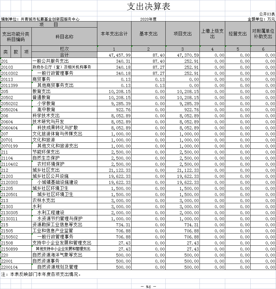 本部门2020年度支出总计47457.9874万元,其中本年支出合计47457.9874万元,较2019年增加8853.925万元,增长22.94%,主要原因是:入驻基金小镇的企业增多,支付给企业的扶持资金增加;年末结转和结余0万元,较2019年增加0万元,增长0%,主要原因是:无结转结余。