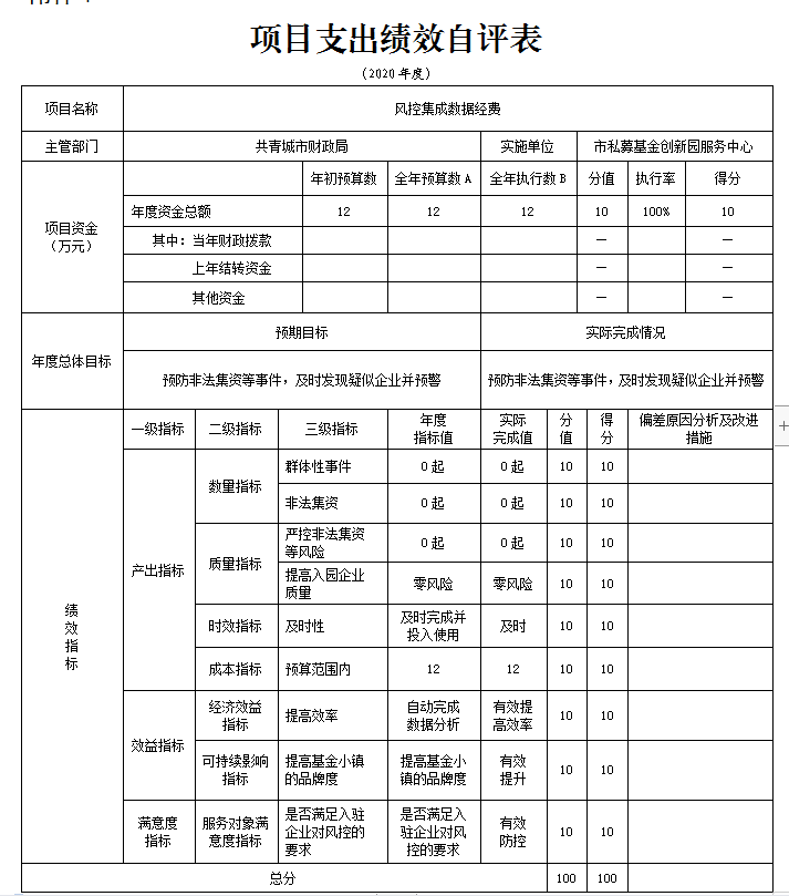 风控集成数据经费项目绩效自评综述:根据年初设定的绩效目标,风控集成数据经费项目绩效自评得分为100分。项目全年预算数为12万元,执行数为12万元,完成预算的100%。项目绩效目标完成情况:一是严控非法集资风险,预防非法集资等事件;二是及时发现疑似企业并预警,提高入园企业质量。发现的问题及原因:个别绩效指标仍需要进一步细化,预算编制需要更加科学、及时。下一步改进措施:加强本单位财务人员的培训工作,完善相关财务管理制度,强化内部控制机制,提升对资金预算的监督管理,提高单位整体和项目专项的监督,明确下一年度工作计划,对下一年度预算资金进行合理编算安排,使得预算编制符合工作计划,同时尽量减少资金未全面执行的情况,如有纰漏及时向上级主管部门反映执行情况,确保预算资金的及时到账和准时完成。