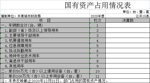截止2020年12月31日,本部门国有资产占用情况见公开10表《国有资产占用情况表》。副部(省)级及以上领导用车0辆、主要领导干部用车0辆、机要通信用车0 辆、应急保障用车0辆、执法执勤用车0辆、特种专业技术用车0辆、其他用车0辆;单位价值50万元以上通用设备0台(套);单位价值100万元以上专用设备 0台(套)。