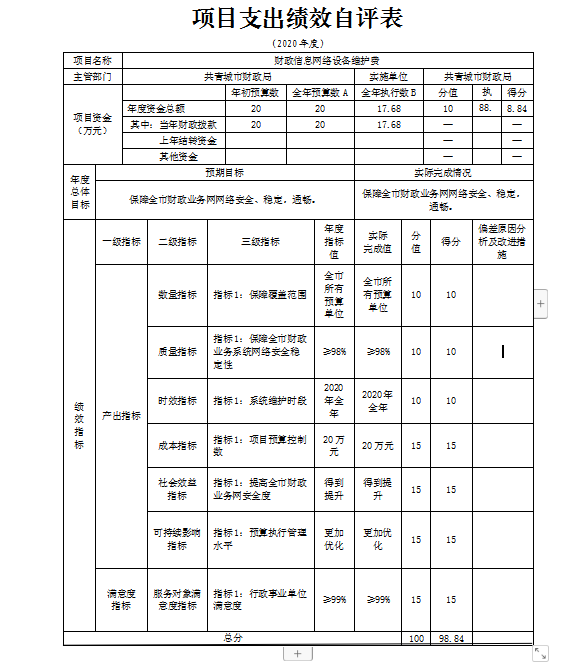 项目绩效自评总体综述:根据年初设定的绩效目标,财政信息网络设备维护费项目绩效自评得分为98.84分。项目全年预算数为20万元,执行数为17.68万元,完成预算的88.4%。项目绩效目标完成情况:一是保障覆盖范围为全市所有预算单位;二是保障全市财政业务系统网络稳定性达到98%以上;三是项目预算控制数不超过20万元;四是行政事业单位满意度达到98%及以上。发现的问题及原因:网络信息安全性有待提高。下一步改进措施:为使财政核心系统稳定运行特开展此项目,通过加强信息安全防护为理念保证全市财政业务网网络安全、稳定、通畅,提高政府管税控税信息化水平。