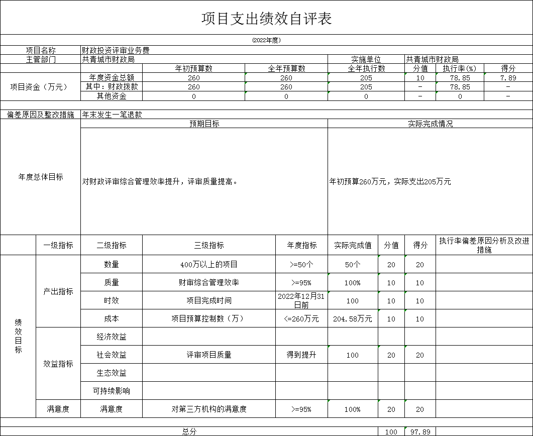 反映2022年度部门绩效自评总报告和《项目支出绩效自评表》