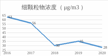 生态环境质量有效提升。坚持贯彻多措并举,多方共治,坚决打好污染防治攻坚战,打胜生态环保持久战,共青城市深化“八大标志性战役26个专项行动”,坚持以环境质量为统领,全面打好大气、水、土壤污染防治三大战役。蓝天保卫战卓有成效。“十三五”期间,共青城通过深入实施“控煤、减排、管车、降尘、禁烧、禁放、治油烟”等专项行动,环境空气自动监测站等基础设施逐步完善。大气主要污染物年均浓度明显下降,2016~2020年,共青城市PM2.5浓度年均浓度累计下降35μg/m3,其中2020年,共青城市PM2.5浓度绝对值为28μg/m3,同比下降20%,PM2.5浓度变化情况见图1。空气优良率为89.9%,同比上升12.7%。空气质量改善率居九江市第一。碧水保卫战稳步推进。“十三五”期间,共青城通过采取源头护水,科学管水、重拳治水等措施,深入推进“河长制”“湖长制”,着力提升水质自动监测能力,扎实开展“排污口整治”、“清河行动”、饮用水水源综合整治及农村环境综合整治等工作。到2020年,共青城地表水水质监测断面(共青城毛厂)和集中式饮用水水源地水质经市环境监测站监测达标率均为100%,水功能区达标率为100%,全市境内考核断面无劣V类水。水环境质量稳步提升。净土保卫战扎实推进。“十三五”期间,共青城开展土壤污染详查、土壤风险管理,实行固废安全处理处置监管,进行危废动态监管,深入开展土壤保护和污染治理行动,有序开展农村面源污染防治工作。2016~2020年,未发生重大土壤污染事故,无新增污染地块。土壤环境质量总体良好。生态系统保护修复有力推进,湿地和越冬候鸟保护工作有序开展。