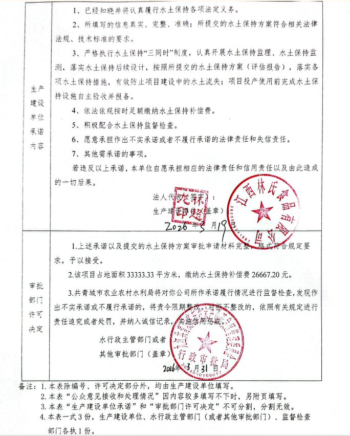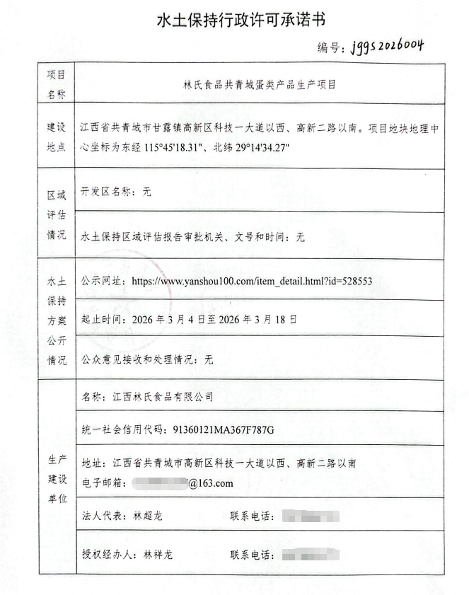 关于林氏食品共青城蛋类产品生产项目水土保持行政许可承诺书