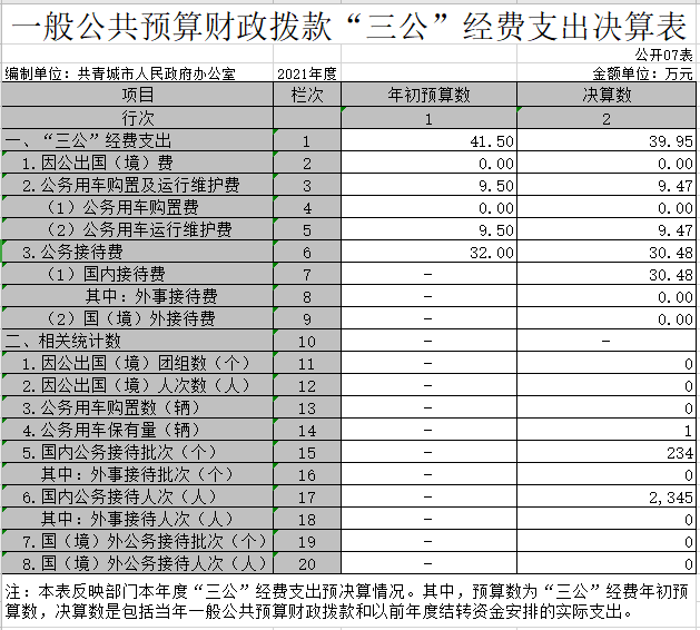 本部门2021年度一般公共预算财政拨款“三公”经费支出年初预算数为41.5万元,决算数为39.95万元,完成预算的96.27%,决算数较2020年增加5.06万元,增长14.5%,其中: